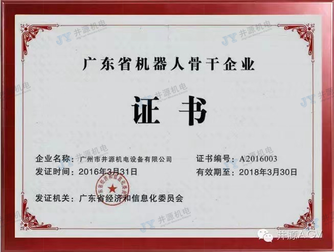 On March 22, 2016, the Guangdong Provincial Economic and Information Commission announced the list of the first batch of robot backbone enterprises in Guangdong Province, and Guangzhou Jingyuan Electromechanical Equipment Co., Ltd. was on the list. Recently, our company officially received the certificate of "Guangdong Robot Backbone Enterprise" issued by Guangdong Economic and Information Commission.