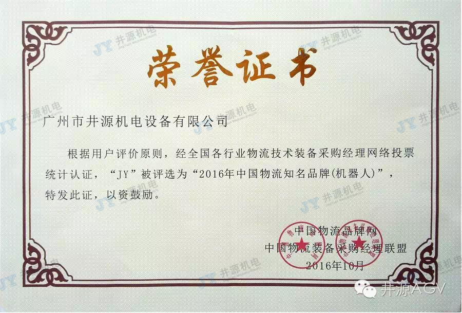 Jingyuan Electromechanical successfully entered the list of well-known brands of China's logistics technology and equipment, and was named "2016 China's Well-known Logistics Brand (Robot)".