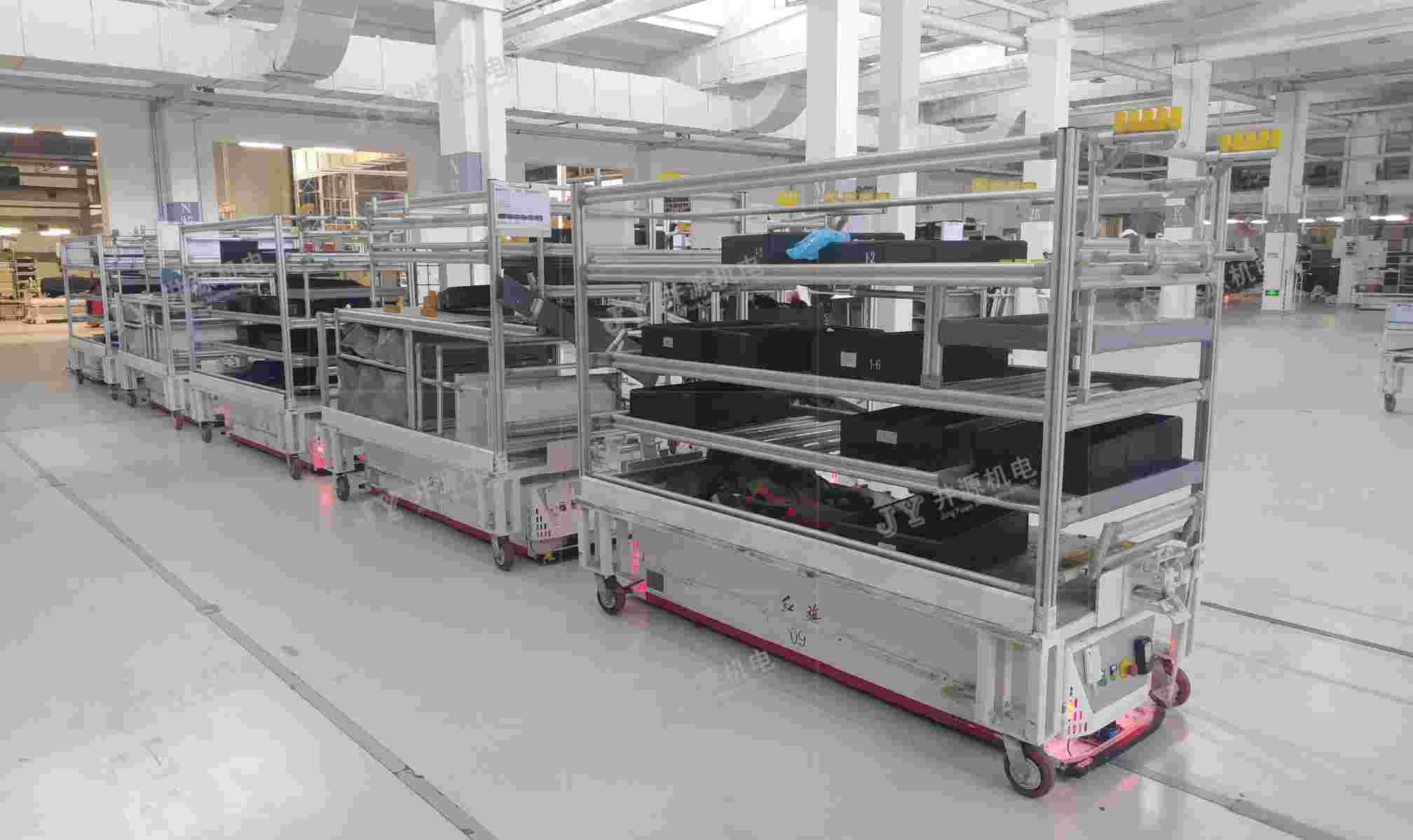Jingyuan Electromechanical AGV has all-round operation function, adopts dual drive mechanism, and uses dual traction pins to realize automatic matching of AGV with different length appliances. In addition, the AGV adopts a fully automatic charging method, which has the function of one-button switch on and off, and the overall control of all AGVs is carried out through the master control system, which is efficient and energy-saving. It is worth mentioning that it realizes the line-side material transportation of narrow channels and the empty-to-full rotation of various materials in the welding workshop, which greatly improves the operation efficiency.
