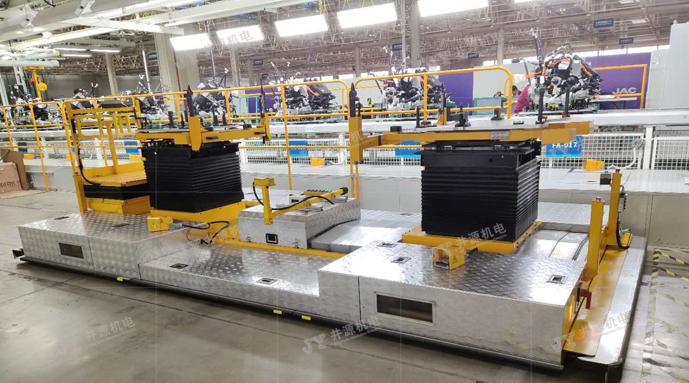 According to different production processes, Jingyuan Machinery's combined AGV has used a battery single-lift combined AGV and a front and rear axle manned three-lift combined AGV in the project. The combined AGV uses advanced technologies such as laser positioning, data acquisition, and synchronous dynamic tracking to realize dynamic assembly of the front and rear axle assemblies at any station in the assembly section, to meet the mixed production of various models, realize flexible production, and reduce production process It can save labor cost and improve production efficiency.