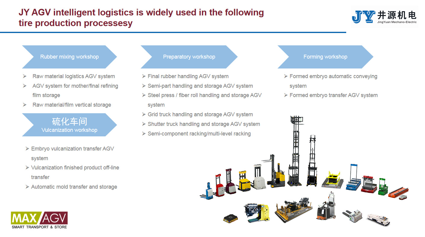 As the upstream industry of the automobile industry, the tire industry has followed the development of the automobile industry and entered a high-speed development stage. At the same time, China as the world's largest consumer, producer and exporter of tires, but also drive the tire industry production and manufacturing enterprises to further promote the factory to achieve intelligent manufacturing decision. JY  tire factory planning and implementation of a number of industry benchmark project cases, AGV is widely used in the refining, parts, molding, curing workshop, is the tire industry to use the most cases, one of the most comprehensive manufacturers.